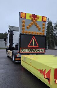 Ajoneuvomme on Euro 6-päästöluokiteltu ja täyttää valotaulunsa ansiosta kaikkien teiden vaatimukset. Valotauluun saadaan vaihdettua erilaisia varoituksia, joita siinä on valmiina. Kuljettajilla on voimassa vähintään tieturva1-kurssi.